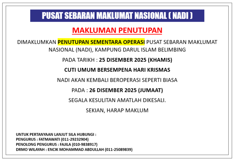 NOTIS PENUTUPAN SEMENTARA OPERASI PUSAT SEBARAN MAKLUMAT NASIONAL (NADI) KAMPUNG DARUL ISLAM BELIMBING