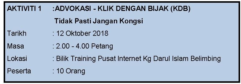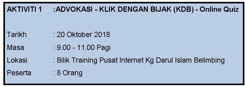 – Memberi pendedahan kepada pelajar dan golonga belia tentang nilai kesedaran yang perlu diterapkan dalam melayari dan mengakses internet.